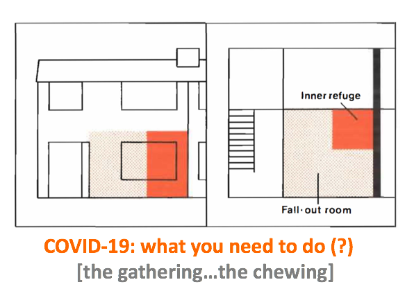 This is a series of short freely improvised pieces by [the gathering…the chewing] – improvising duo Geoff Bright and Gillan Whiteley – recorded under ‘lockdown’ conditions on Monday 27 April 2020 . We are struck by disturbing similarities between policy responses to 1970s government recommendations in the event of a ‘nuclear attack and, recently, Covid-19. Both Protect and Surviveand current government advice such as Protect Yourself and Loved Ones constructed war and viral contagion as a response to an ‘enemy’ – thus completely occluding capitalism’s responsibility for the evermore ecologically degrading effects of globalised consumption – its harnessing of ‘forces of destruction’, as it might be said. Both responses also centralised capitalism’s increasingly irrelevant nuclear family unit as the locus of meaningful ‘survival’. Neither of these constructions are self-evident and we refuse to assent to their logic. Indeed, in conditions of global ecological crisis, it is ludicrous. To that end, this project develops our focus on a politicised improvisative practice that we are calling sonus inter/alter – a kind of ‘sounding between/against’ that draws on the legacy of Italian autonomism, other dissident Marxisms and the work of Deleuze and Guattari.